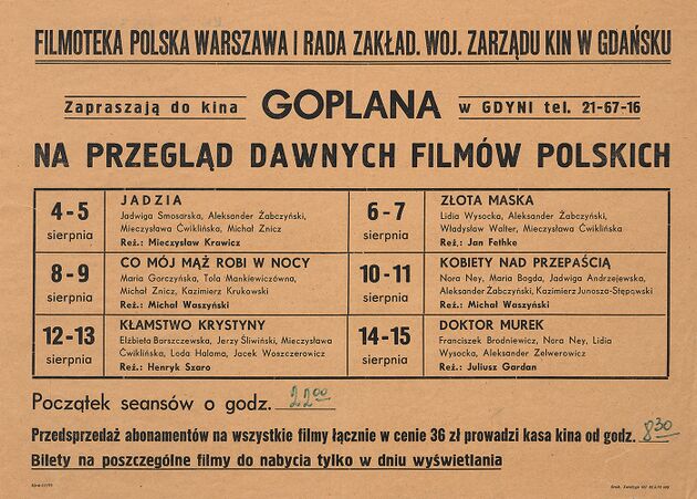 Ciekawy zbiór stanowią ulotki reklamowe filmów z pieczątkami przedwojennych gdyńskich kin. Można zobaczyć, jaki repertuar był popularny w gdyńskich kinach okresu międzywojennego, jak w przypadku filmu Wiatr od morza, którego prapremiera odbyła się w Morskim Oku w 1931 r.