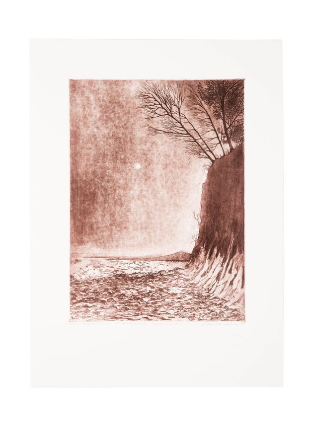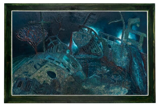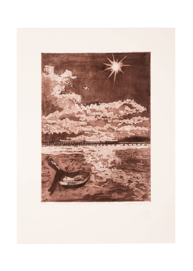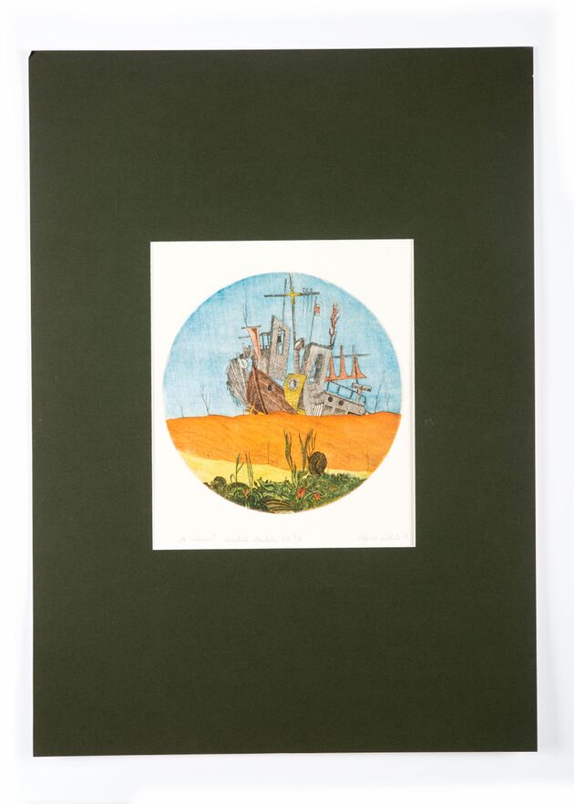 W innych pracach dominuje aura tajemnicy i egzystencjalnego niepokoju. Niedopowiedzenie, wrażenie zagubienia, osamotnienia.. takich emocji możemy doznać oglądając m.in. grafikę pt. Wrakowisko z zardzewiałymi, tajemniczymi szczątkami samolotów i statków. W pracy pt. Odpływ spowita obłokami, nadniszczona, stożkowa budowla budzi skojarzenia z biblijną wieżą Babel, a całe jej pobliskie otoczenie - z poniekąd postapokaliptyczną scenerią.