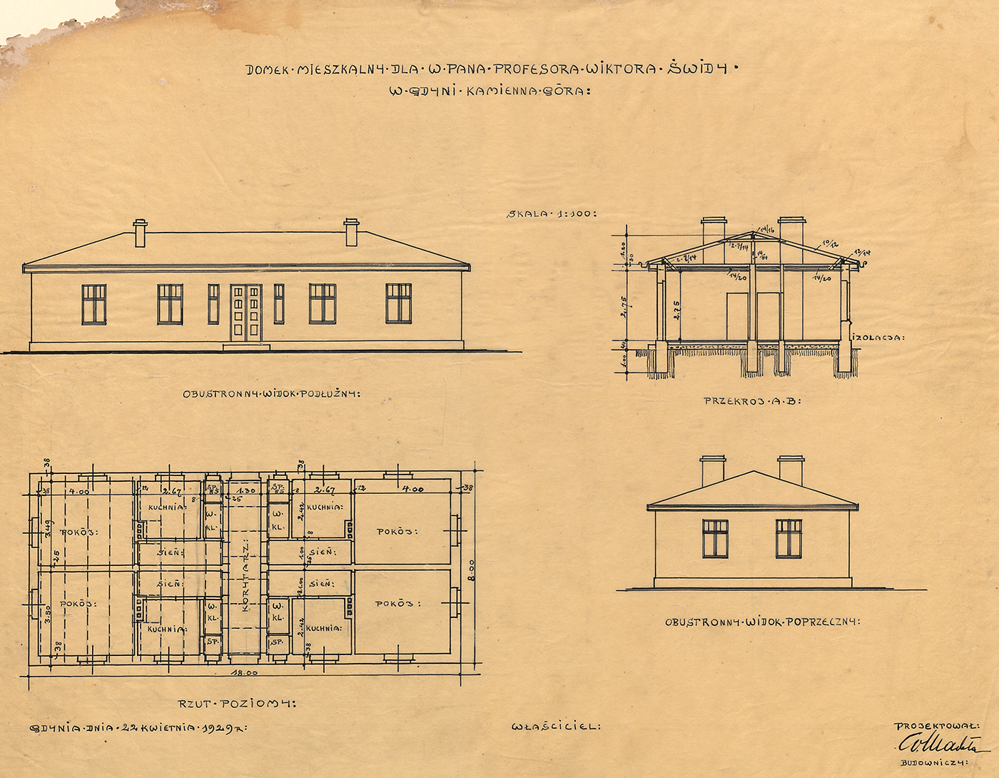 Rysunek projektu budowlanego—Domku mieszkalnego dla w. Pana profesora Wiktora Świdy w Gdyni, Kamienna Góra